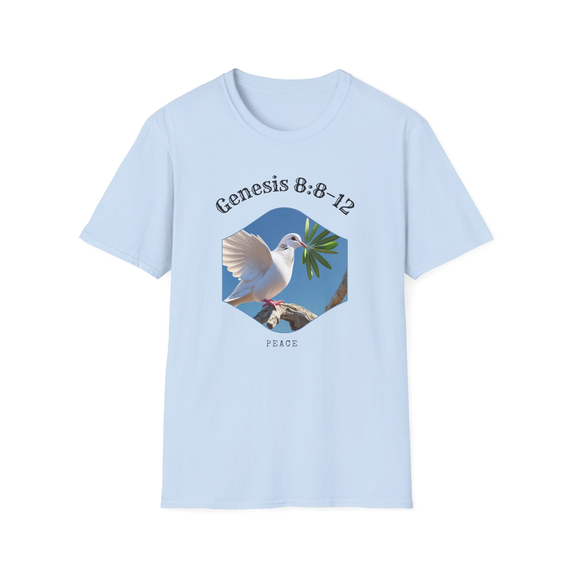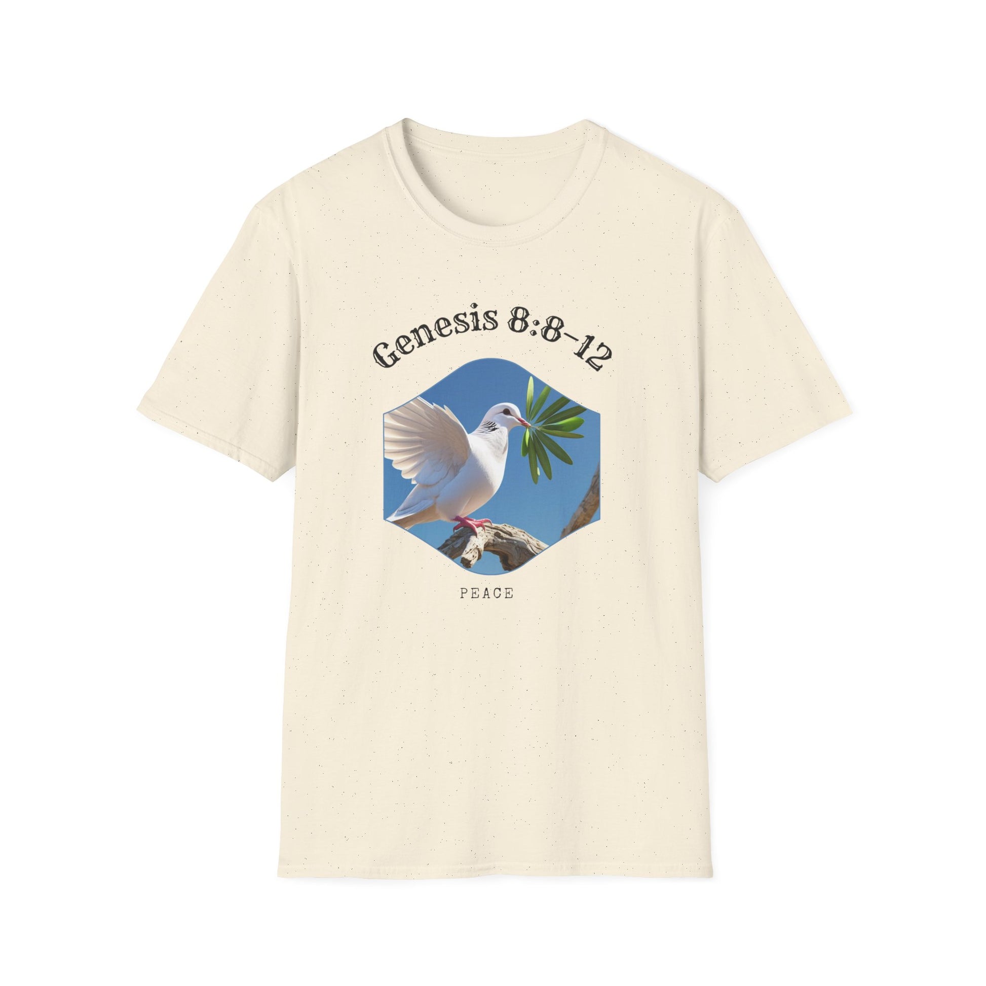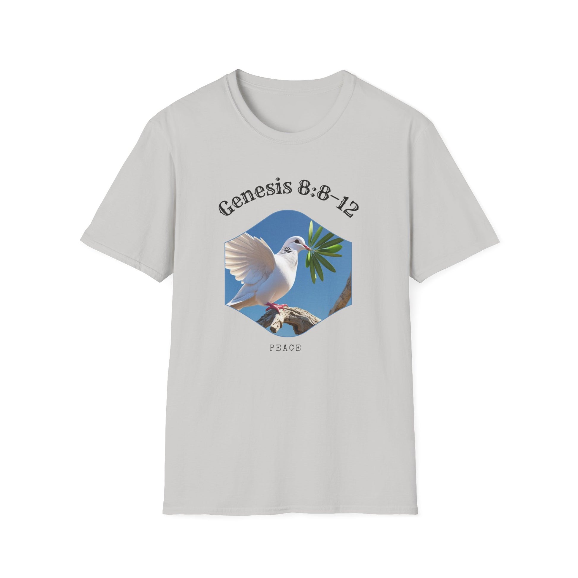 A unisex softstyle t-shirt featuring a peaceful design of a dove with an olive leaf, symbolizing Genesis 8:8–12 and representing peace, new beginnings, and hope. This versatile t-shirt is perfect for daily wear and can easily be dressed up or down for any occasion. Ideal for adults looking for a comfortable and meaningful piece of clothing. Great for religious holidays, spiritual events, or anyone seeking a symbol of peace and hope.