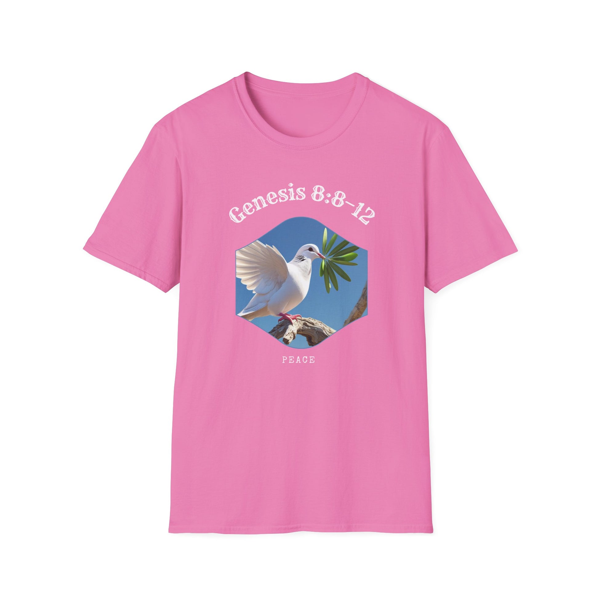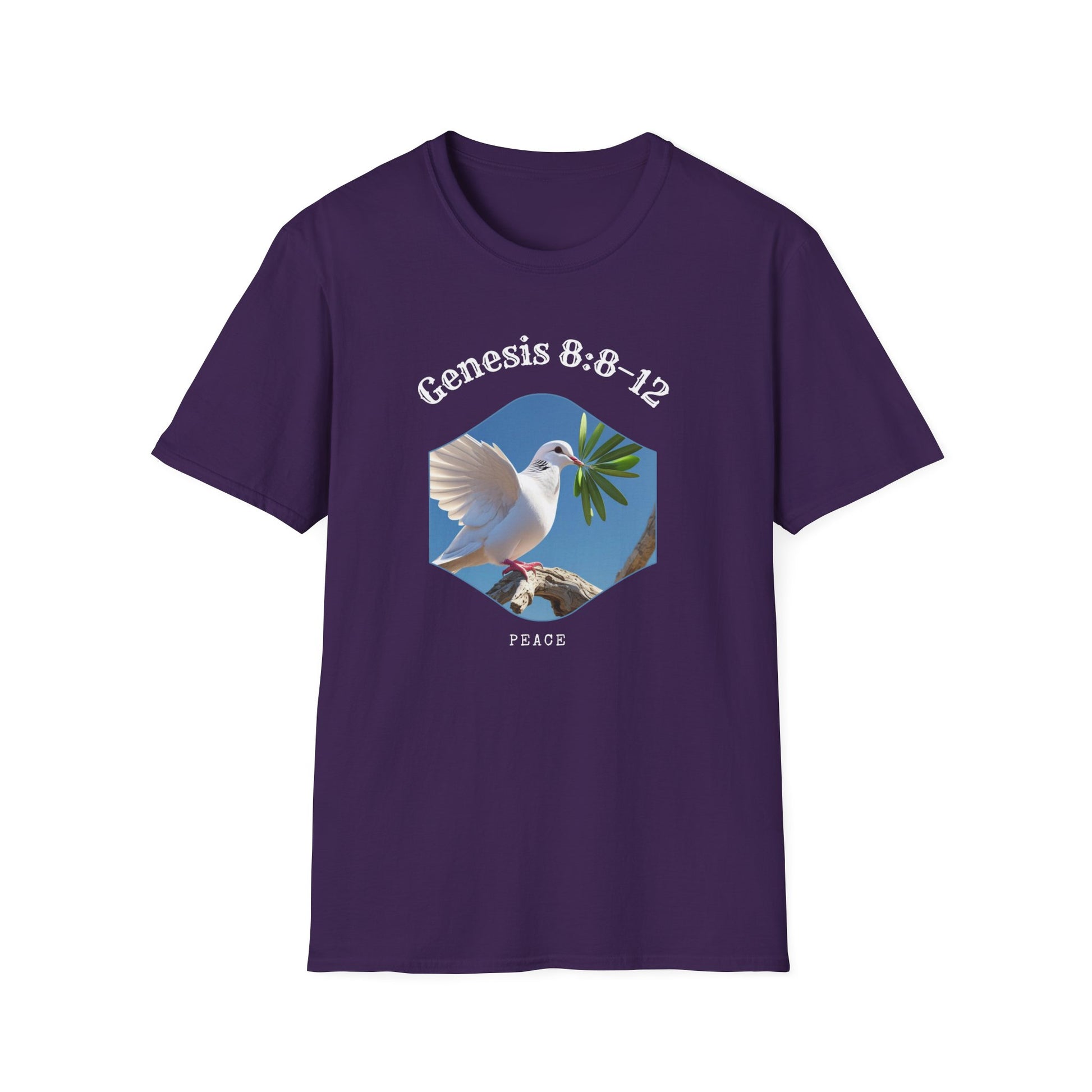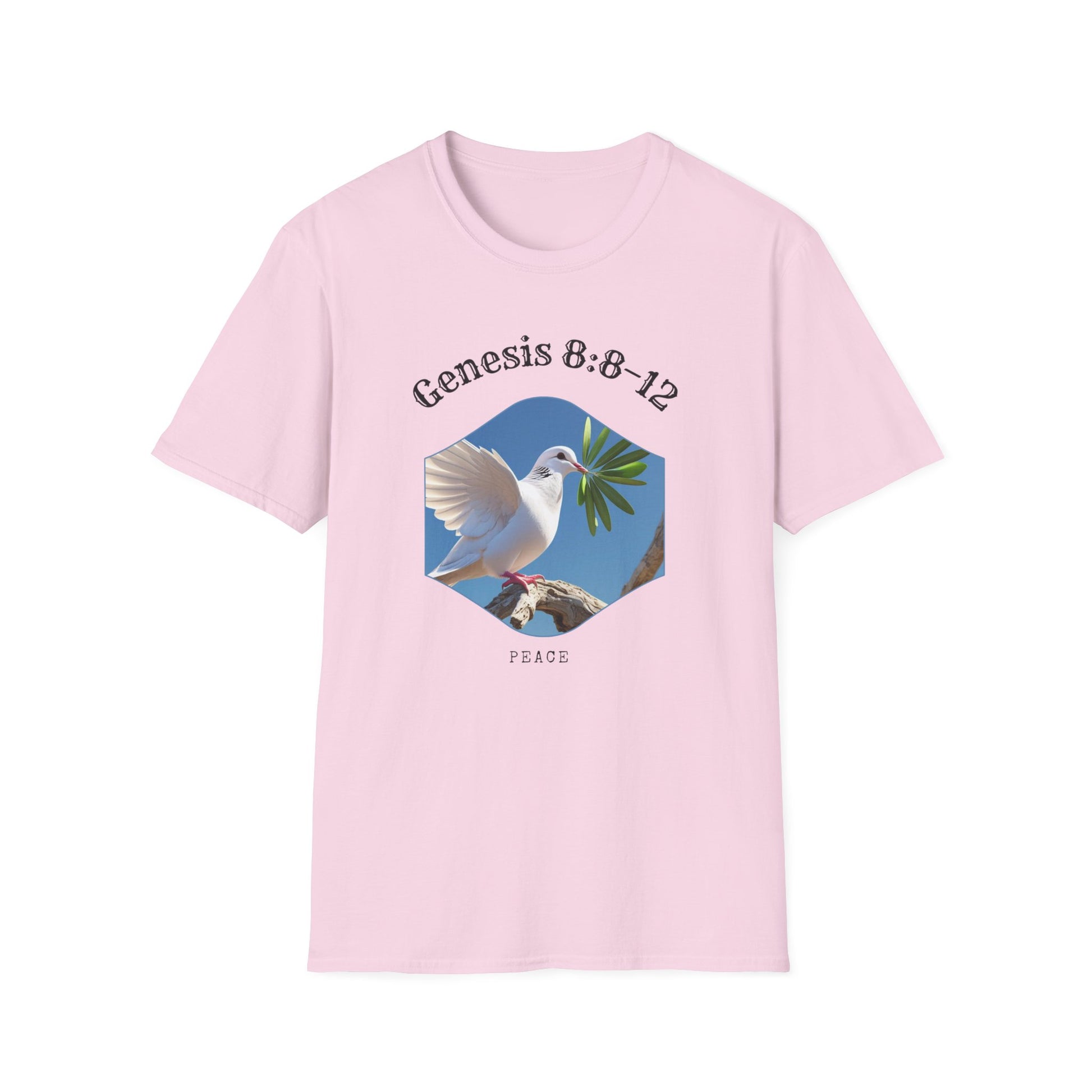 A unisex softstyle t-shirt featuring a peaceful design of a dove with an olive leaf, symbolizing Genesis 8:8–12 and representing peace, new beginnings, and hope. This versatile t-shirt is perfect for daily wear and can easily be dressed up or down for any occasion. Ideal for adults looking for a comfortable and meaningful piece of clothing. Great for religious holidays, spiritual events, or anyone seeking a symbol of peace and hope.