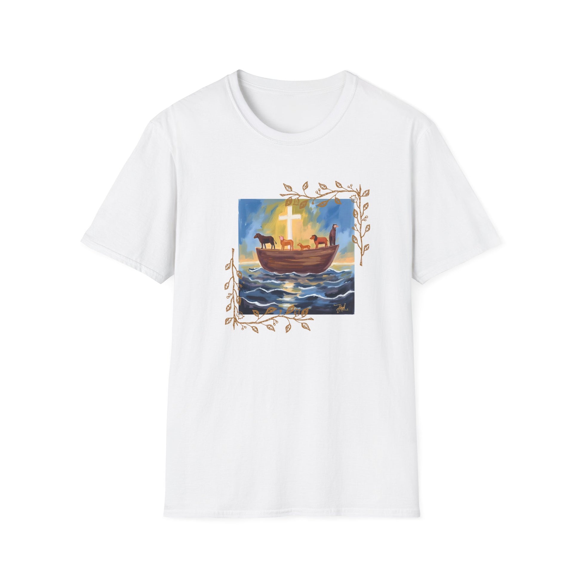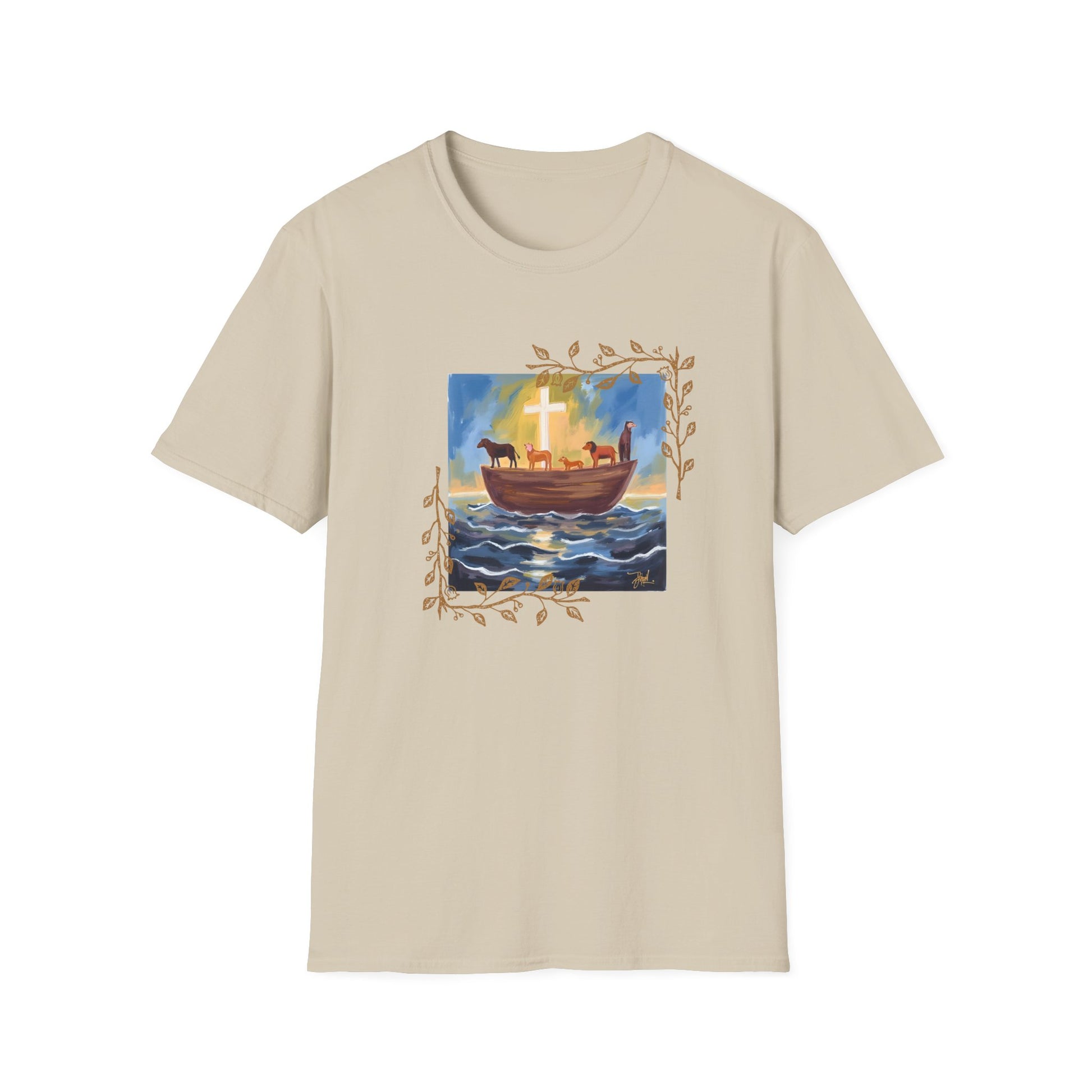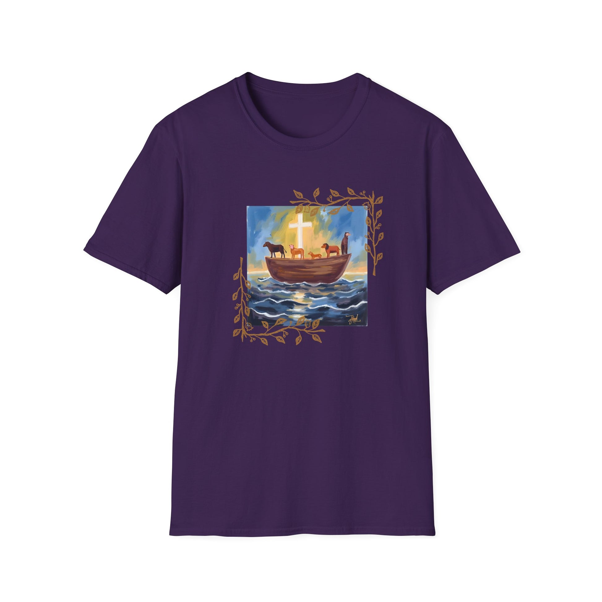 A watercolor Noah's Ark painting adorns this unisex softstyle T-shirt, giving a peaceful and artistic vibe. Perfect for those who appreciate religious motifs and nature-inspired designs. Ideal for religious holidays, church events, and everyday casual wear.