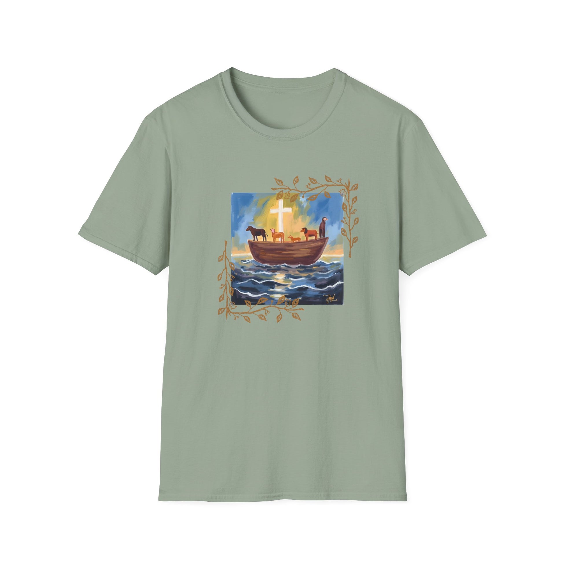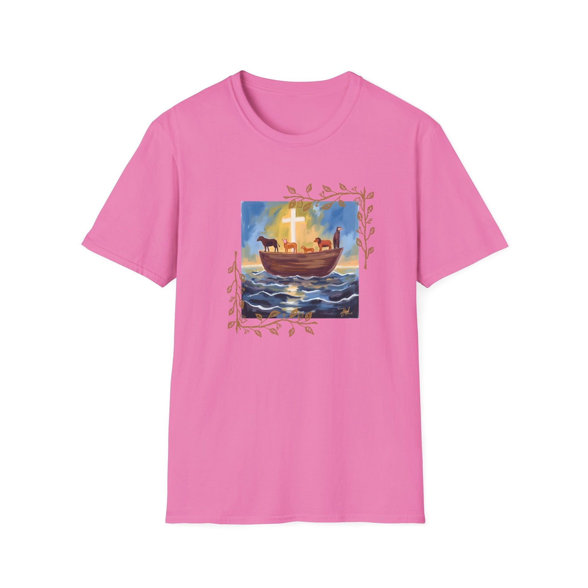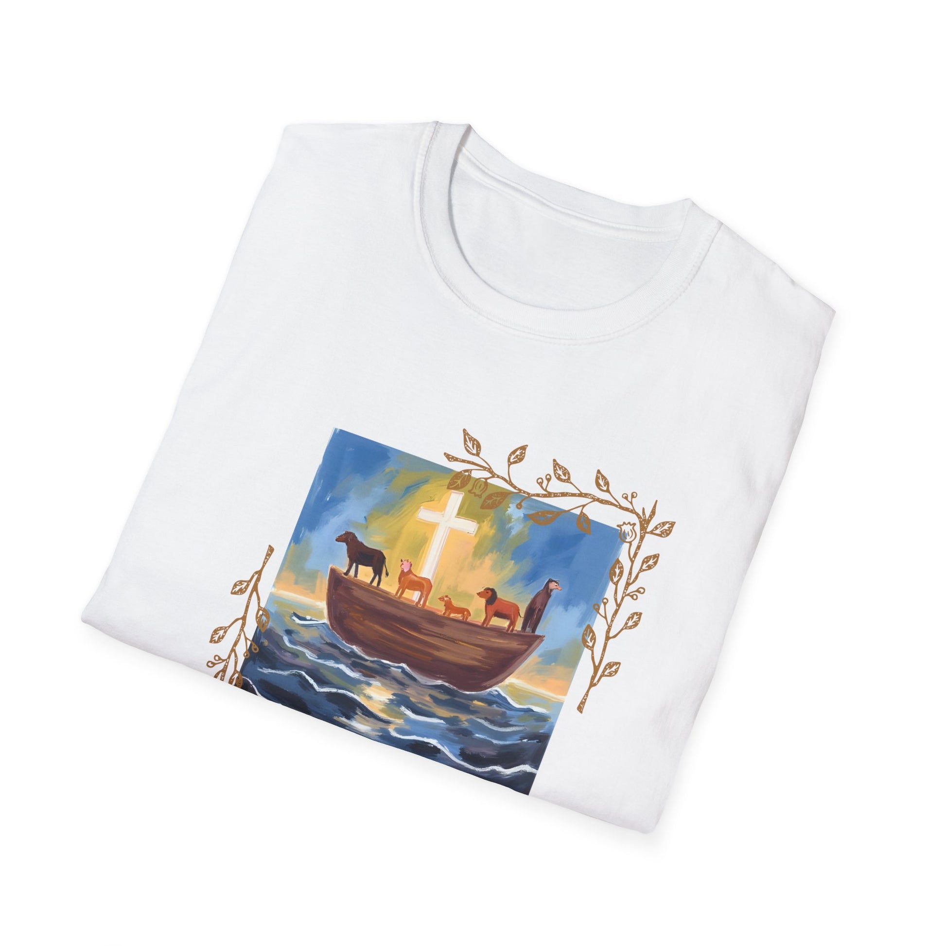 A watercolor Noah's Ark painting adorns this unisex softstyle T-shirt, giving a peaceful and artistic vibe. Perfect for those who appreciate religious motifs and nature-inspired designs. Ideal for religious holidays, church events, and everyday casual wear.